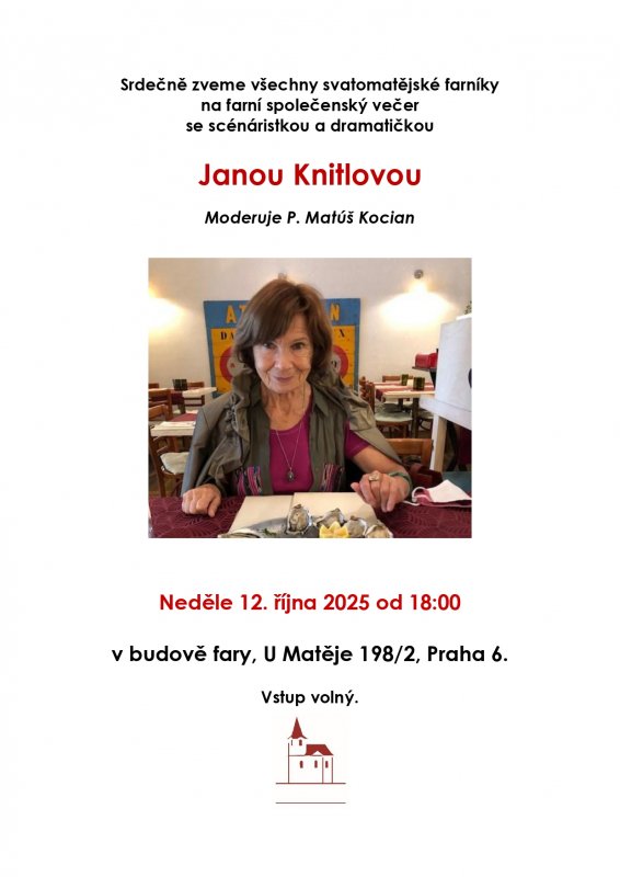 Srdečně zveme všechny svatomatějské farníky na farní společenský večer se scenáristkou a dramatičkou Janou Knitlovou. V neděli 12. října od 18:00 na faře u sv. Matěje. Moderuje P. Matúš Kocian.