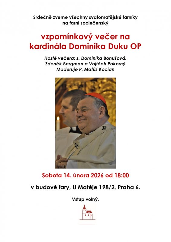 Srdečně zveme všechny svatomatějské farníky na farní společenský večer věnovaný vzpomínce na kardinála Dominika Duku OP. V sobotu 14. února od 18:00 na faře u sv. Matěje. Hosté: s. Dominika Bohušová, Zdeněk Bergman a Vojtěch Pokorný. Moderuje P. Matúš Kocian