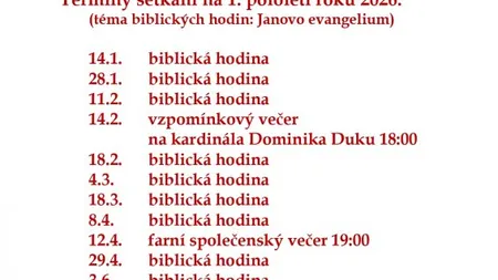 Termíny na 1. pololetí roku 2026. Setkání probíhají ve velké společenské místnosti na faře u sv. Matěje. Tématem biblických hodin je Janovo evangelium.