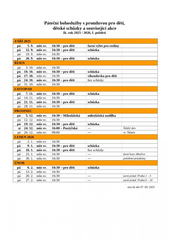 Páteční bohoslužby s promluvou pro děti, dětské schůzky a související akce v 1. pololetí školního roku 2025/2026.
